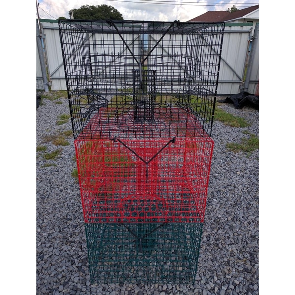 We have 2 Funnel, 3 Funnel, and 4 Funnel Crab Traps in stock. Large selection of colors, Green, Black, Red, Yellow, and Lime Green.